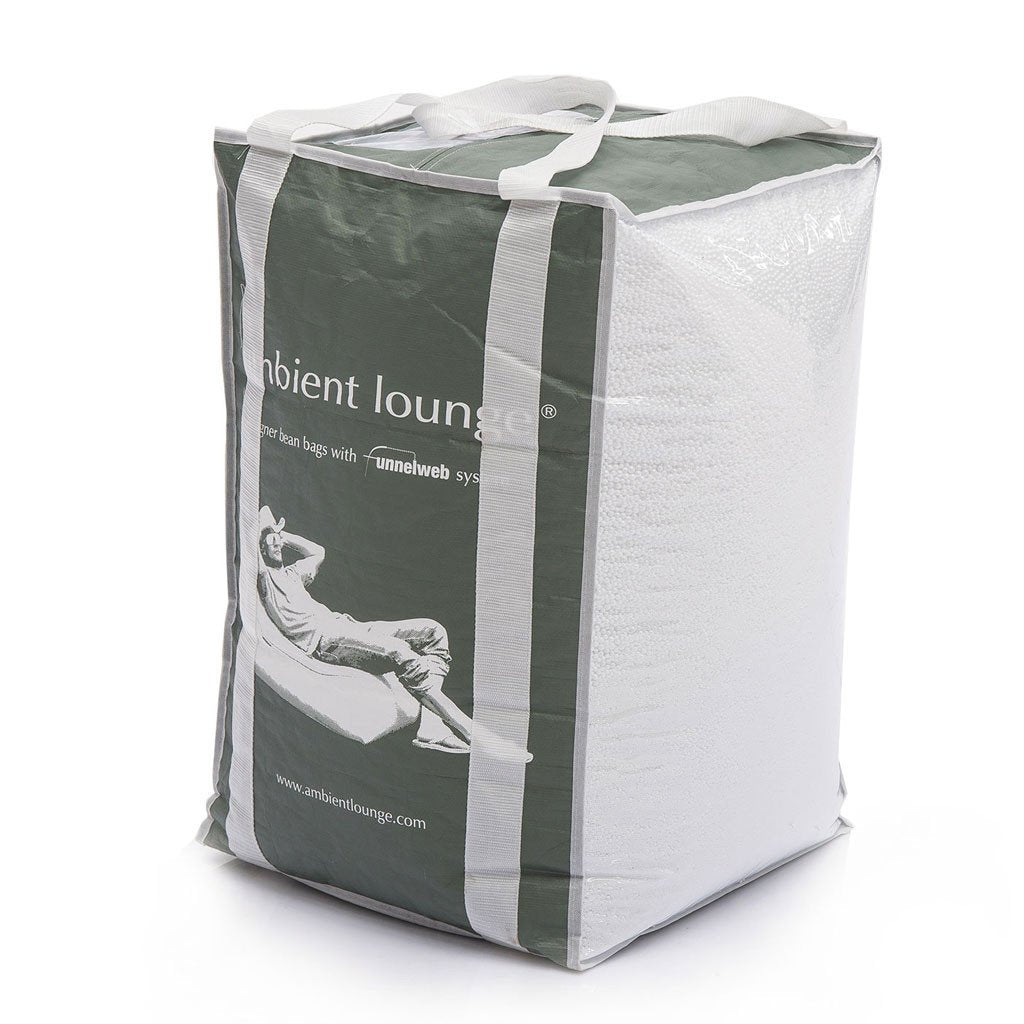 No longer will you need to be carting awkward bags around shopping centers, spilling bean bag beans all over your lovely home, wrestling with plastic bags and get half the family to help you fill or top up a bean bag. Ambient Lounge bean bag filling comes in the patented Funnelweb™ Zip & Tip System Bag - delivered in an environmental-friendly reusable outer transport bag direct to your door. It’s a one person job that is quick, convenient and easy. We provide smaller, denser and of higher quality beads that last longer than supermarket beads. Sitting is believing. No matter where you are – whether in the top of Scotland, east of England or the bottom of Wales, we sell and deliver three great (and beautifully packaged) sizes of quality bean bag bean filling anywhere within EU. Our 150+plus bags are fabulous for reusable filling and maintenance. For jumbo-sized bean bags and bulk bean bag deals, please call us and we’ll be happy to assist.