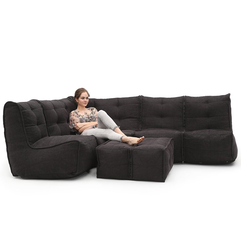 Die LIVING LOUNGE überzeugt durch angenehme Stoffe, hochwertige Füllung und eine Struktur im Inneren. So bietet die den Komfort von klassischen Beanbags, die Stabilität von Designer-Möblens und die einzigartige Optik von Ambient Lounge®. Die 5 Komponenten (Ecksofa, drei Einzelsitze & zweiteiliger Ottomane) sind per Reißverschluss-System verbunden und können auch getrennt und einzeln genutzt werden. Transformiere dein Modular-Set von einer gemütlichen Wohnzimmer-Lounge in nur wenigen Minuten zur entspannten Sitzrunde für deine Freunde. Entspannte Filmabende allein oder mit Partner und gesellige Partys und soziale Events... mit der LIVING LOUNGE musst du dich nicht festlegen.