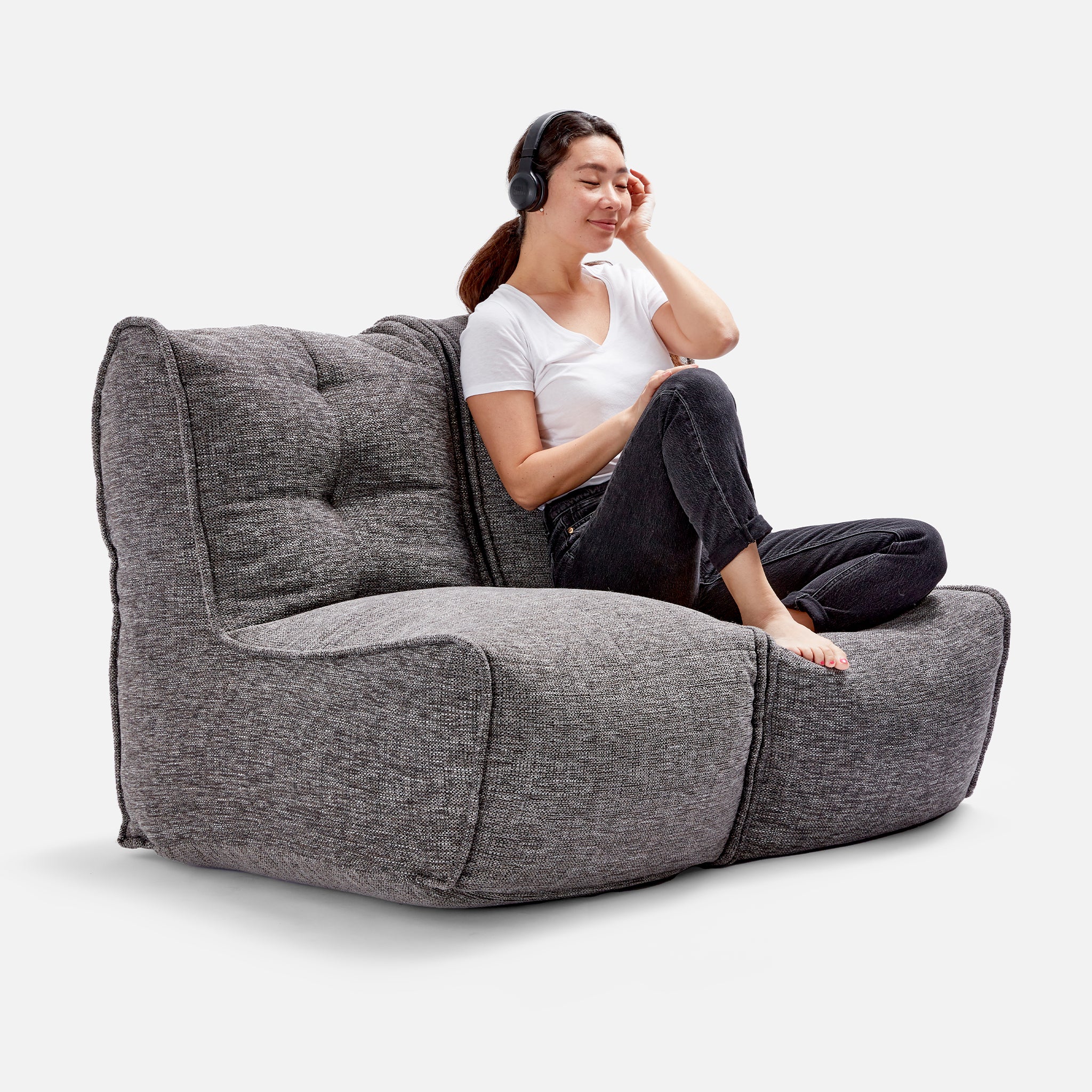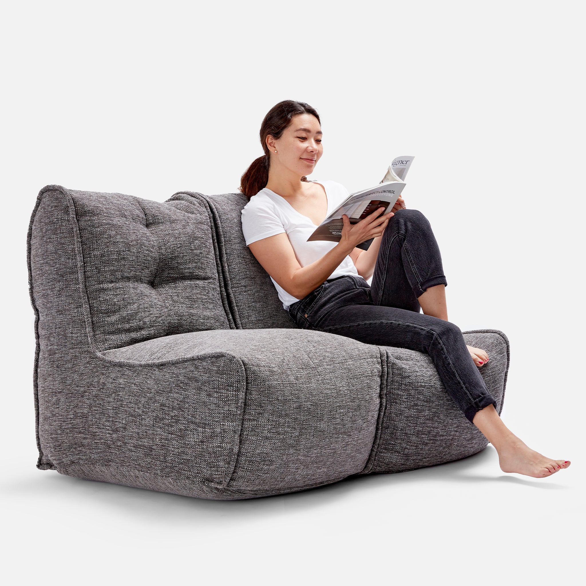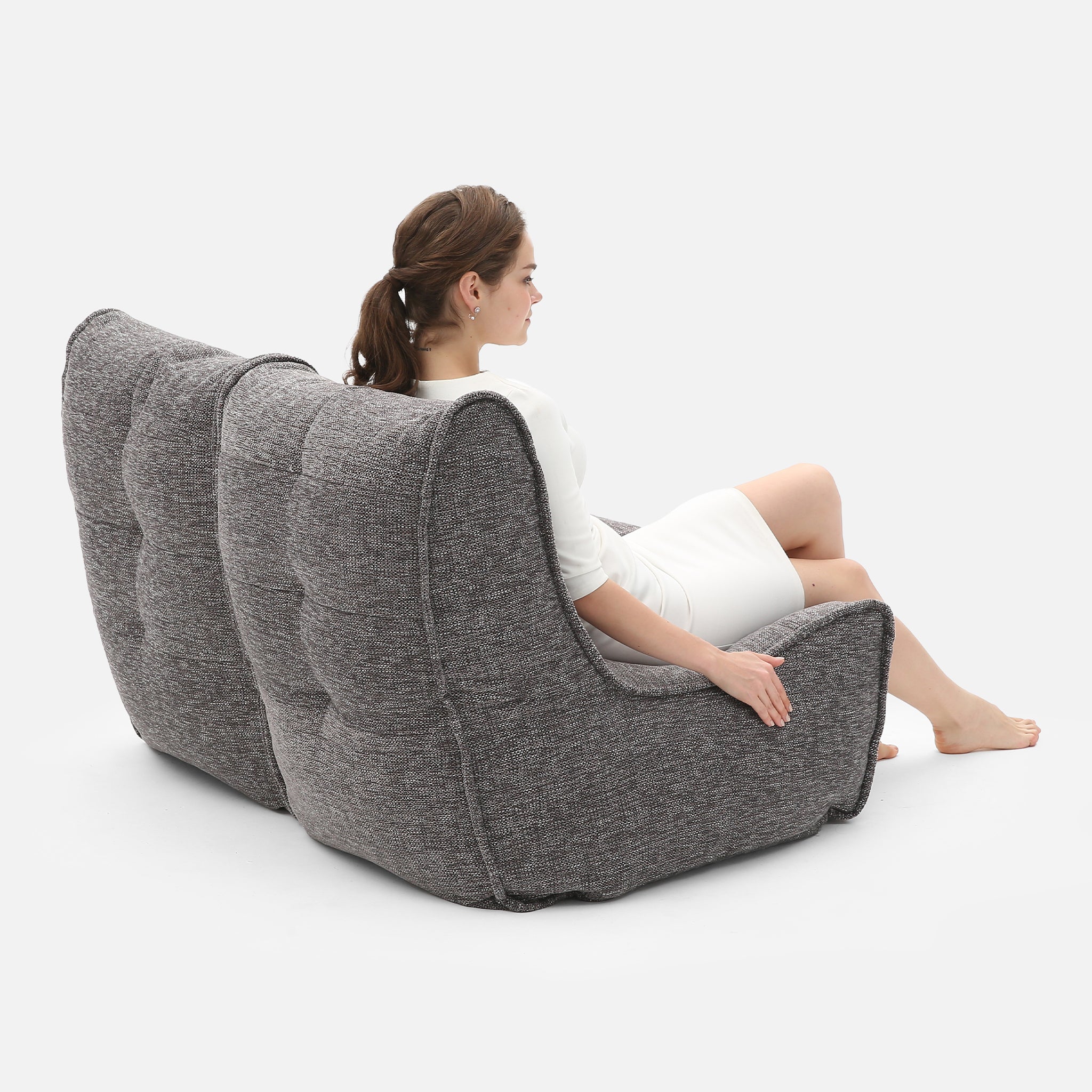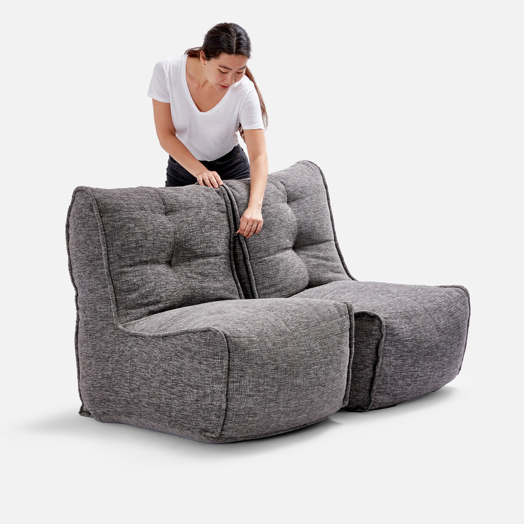 Super weich und angenehm auf der Haut - der LusciousGrey Stoff ist einer unserer Publikumslieblinge. Neben hohem Komfort bietet er außerdem ein elegantes Antlitz. Damit ist die TWIN COUCH auch ein optisches Highlight in deiner Inneneinrichtung. Die ausgeklügelte Form und eine Struktur aus elastischen Bändern im Inneren machen die Sitzsack-Couch zu einem Designermöbel. Perfekt für das Wohnzimmer, das Arbeitszimmer, das Kinderzimmer oder auch das eigene Heimkino. Stell mehrere unsere Beanbags und Sitzsäcke nebeneinander und kreiere deine eigene Designer-Lounge. Die Besonderheit der TWIN COUCH ist, dass du die beiden Sofahälften per robustem Reißverschluss trennen und verbinden kannst. Dadurch kannst du sie auch einzeln als Sitze benutzen. Wir empfehlen die TWIN Variante – perfekt zum zweisamen Entspannen.